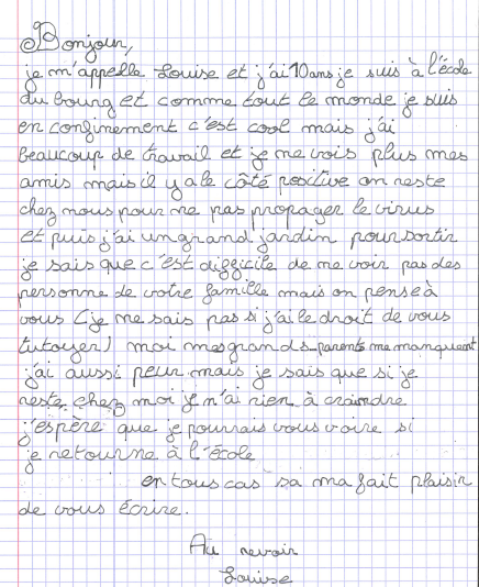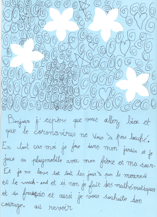 Nous adressons un chaleureux merci à toutes les familles qui nous soutiennent et qui chaque jour manifestent leur soutien aux soignants et réconfortent les résidents par leurs courrier et dessin que nous réceptionnons dans notre boite aux lettres virtuelles #derrierenosmurs.