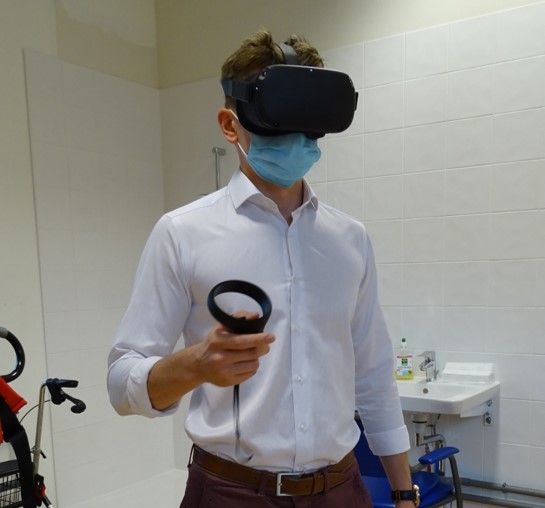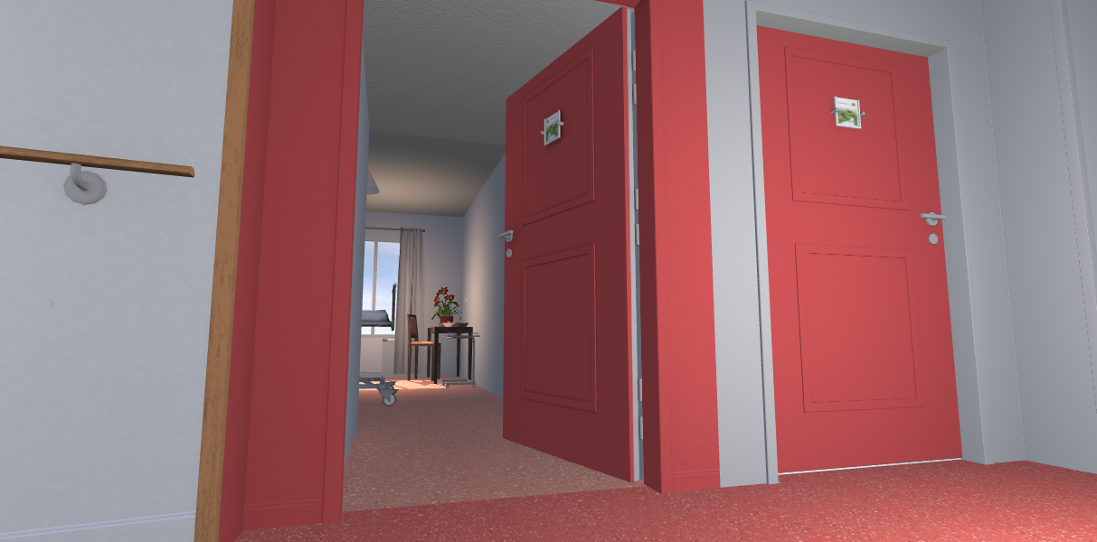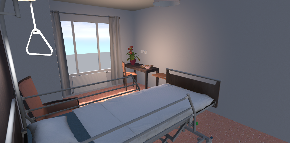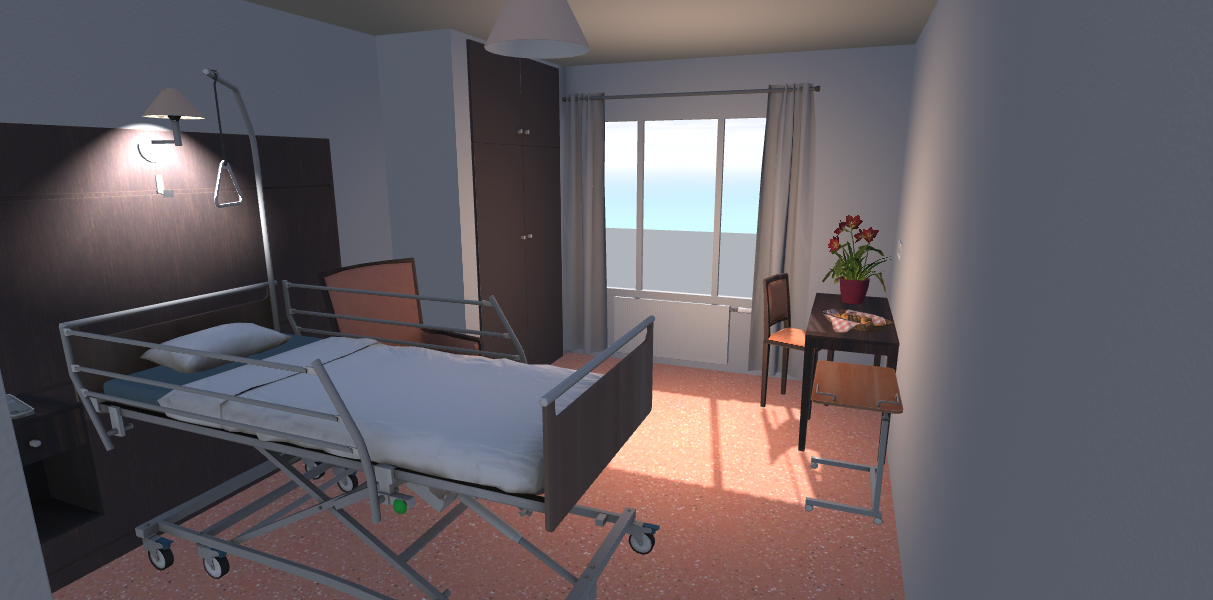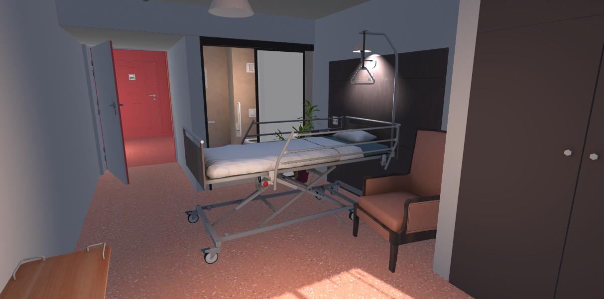L’objectif est de recréer une chambre de patient en EHPAD, dans laquelle l’utilisateur peut se former aux pratiques et procédures via une simulation 3D la plus réaliste possible (le contenu de la réalité virtuelle, visuel, dimension des chambres… a été calqué sur l’environnement de notre EHPAD Le Gareizin).