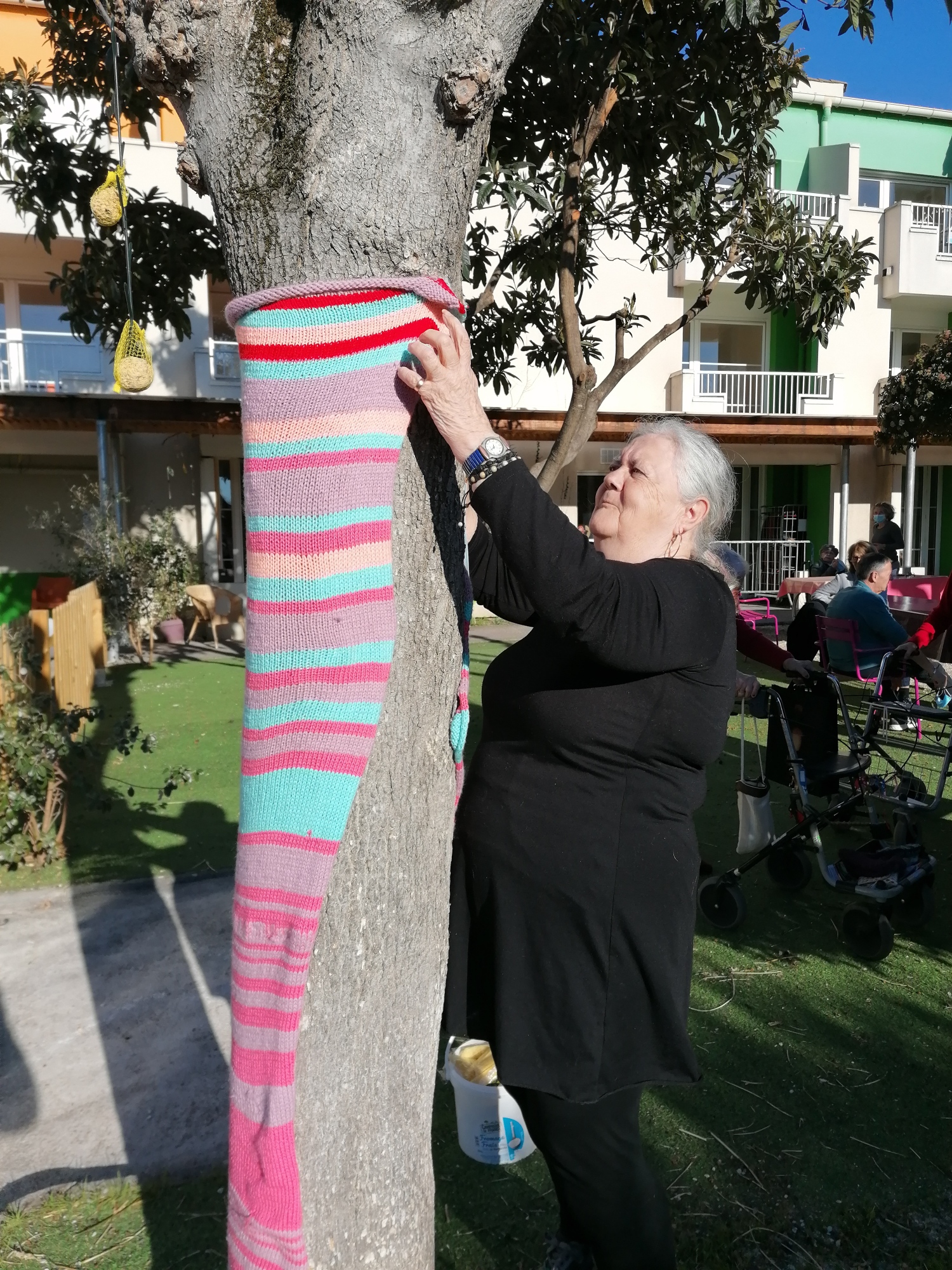 Les équipes de la résidence l’Oustalet ont repris cette pratique pour décorer et animer leur établissement. Avec l’aide des résidents, ils ont décoré les arbres du jardin de la résidence grâce aux chaussettes tricotées lors de l’atelier tricot du vendredi après-midi.