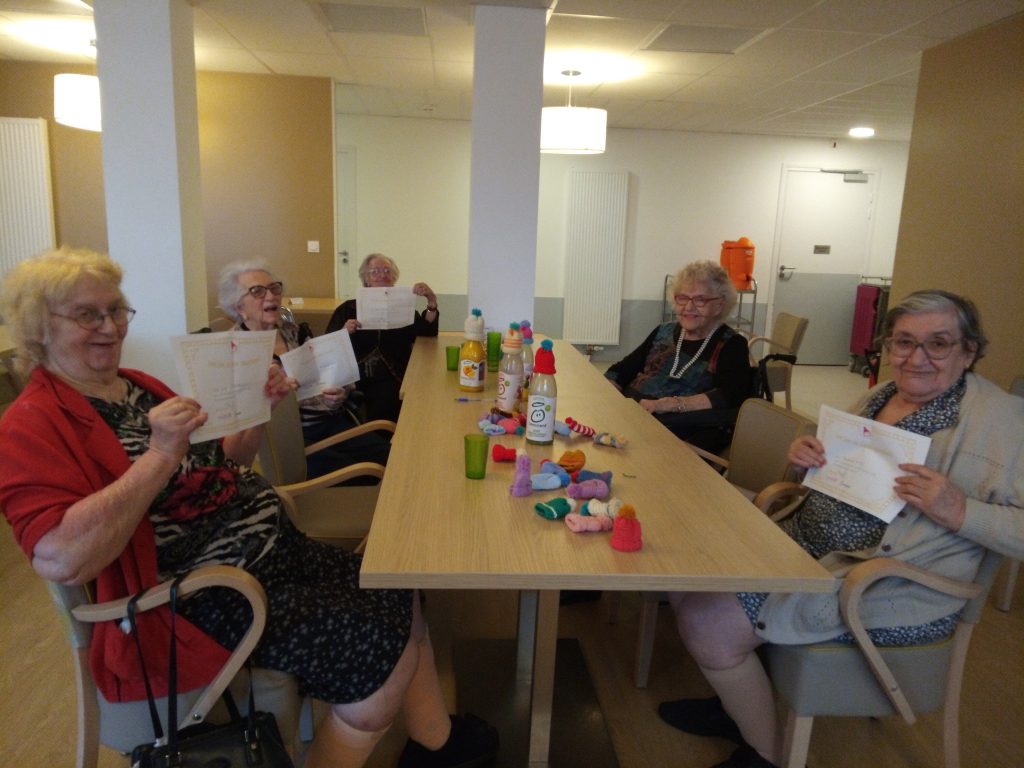 Pour remercier les participantes, Eric, directeur de l’association dans le secteur de Bron, est venu aux Agapanthes le 23 novembre pour rendre visite aux résidentes volontaires et leur remettre un diplôme de « super-tricoteuse » !
