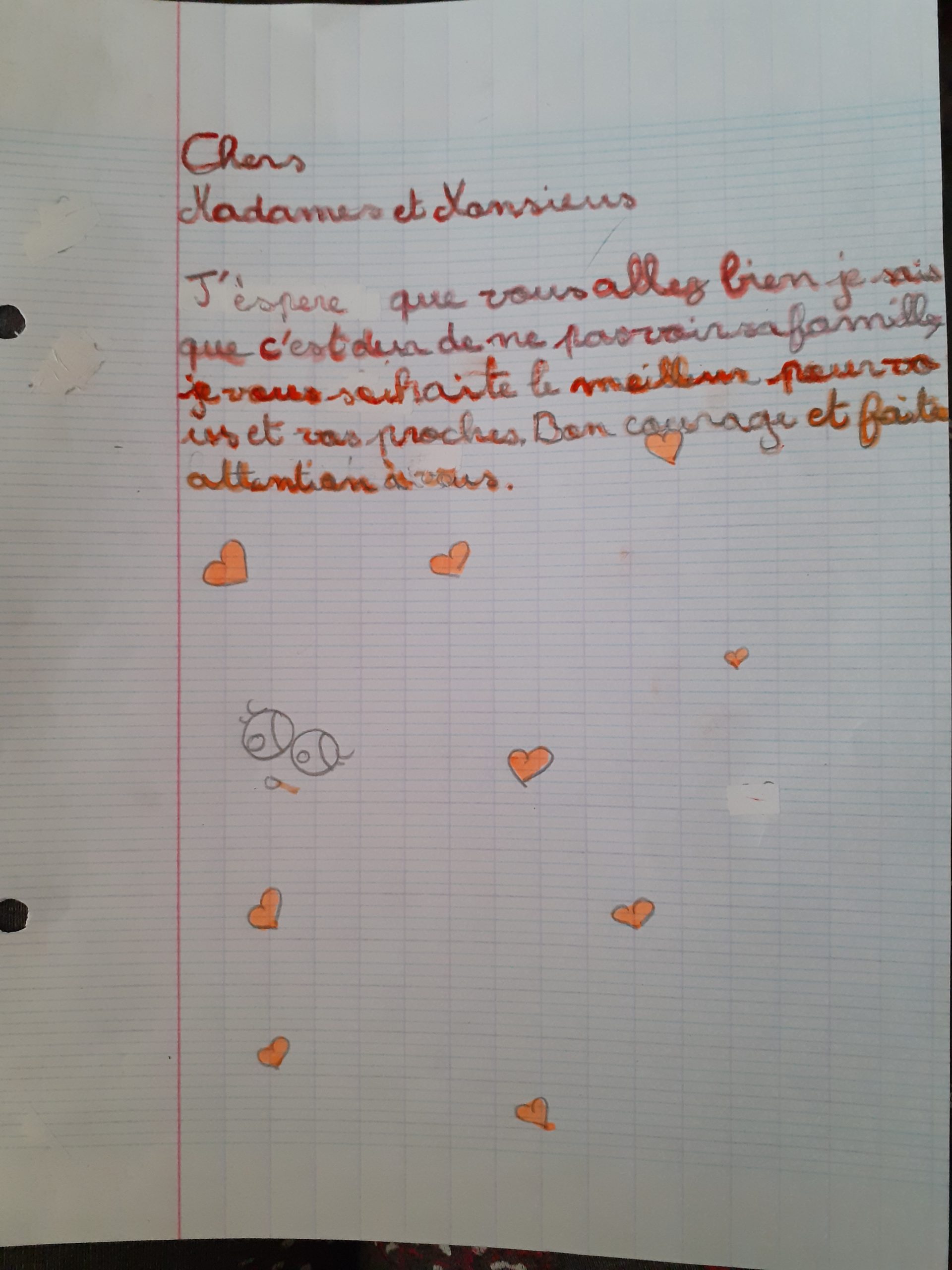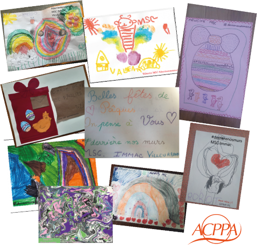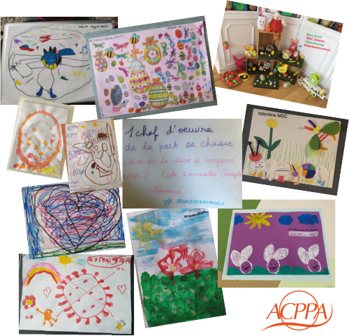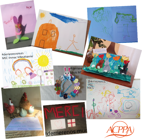 Les élèves de Moyenne section de l’école Immaculée conception à Villeurbanne (69) ont tous profité du weekend Pascal pour donner libre cours à leur imagination. Sous la houlette de leur institutrice Mélanie, ces chefs d’oeuvre ont été postés sur les réseaux sociaux avec le hashtag #derrierenosmurs et sont adressés à l’ensemble de nos résidents et soignants de nos EHPAD. La classe Cm1-Cm2 de l’école Pierre et Marie Curie de Vaulx-en-velin (69) a choisi quant à elle de manifester son soutien à la Résidence #LesAlthéas et de réchauffer les cœurs des résidents grâce à deux outils indispensables : le dessin, et l’écriture.