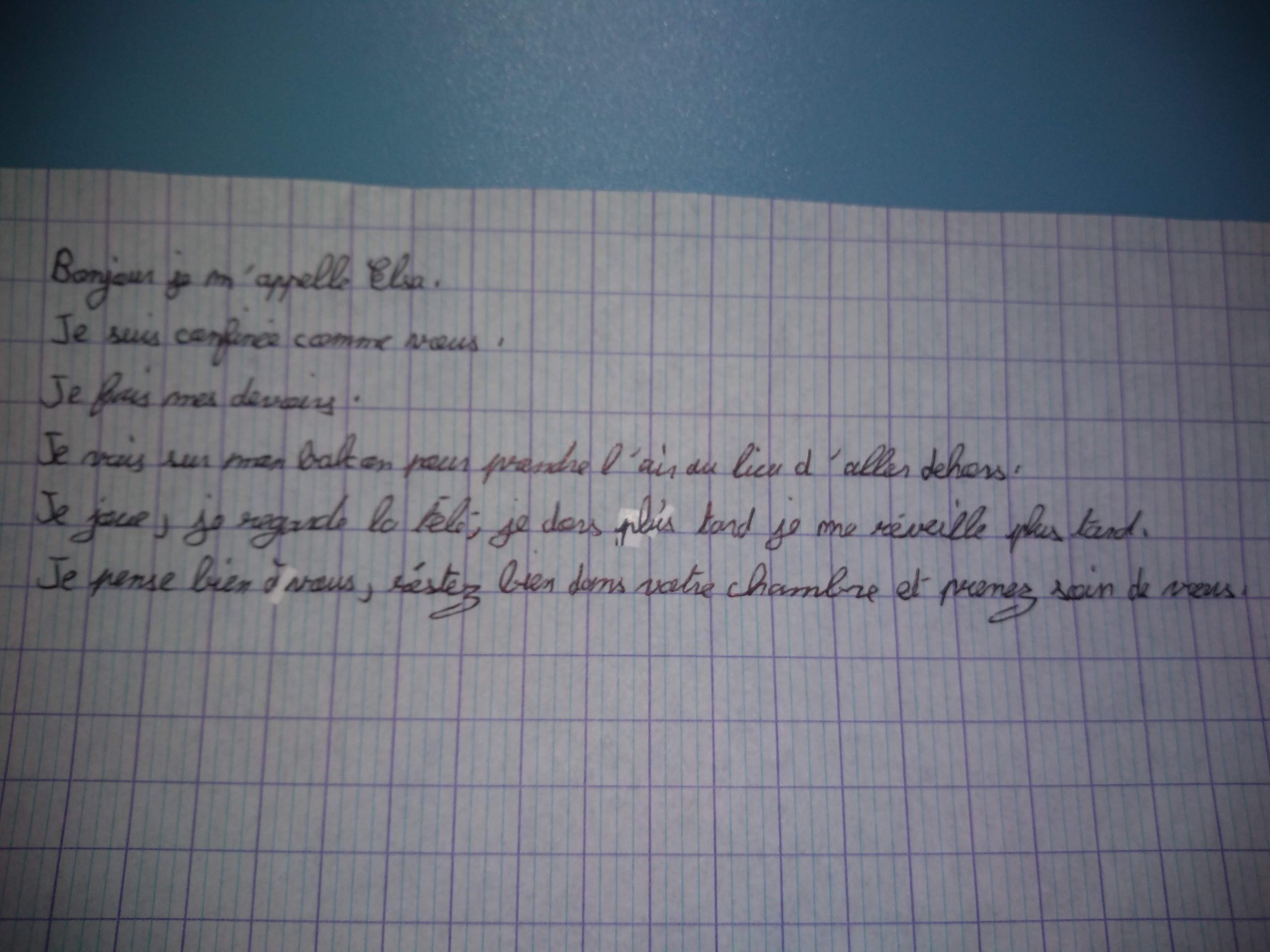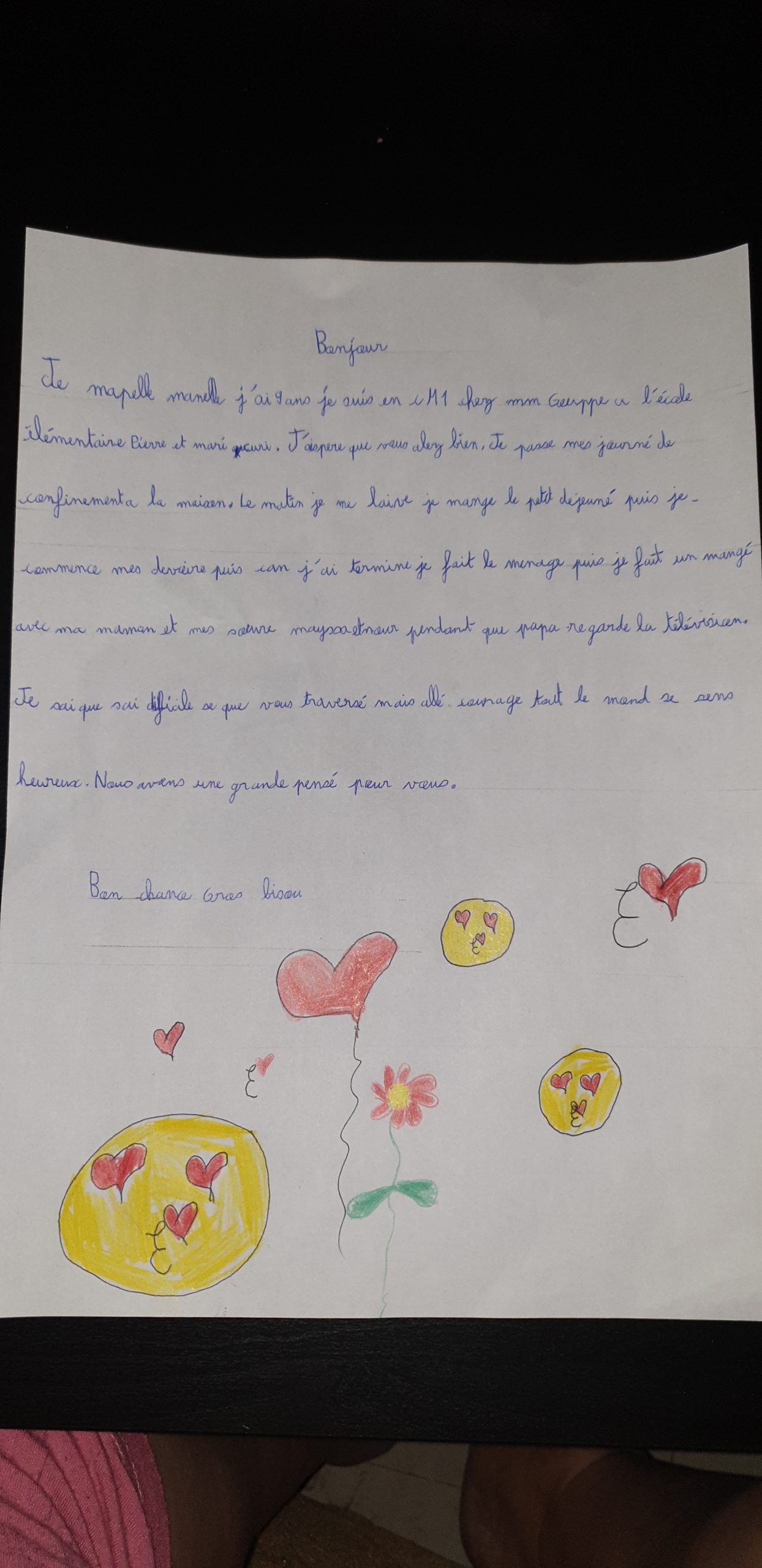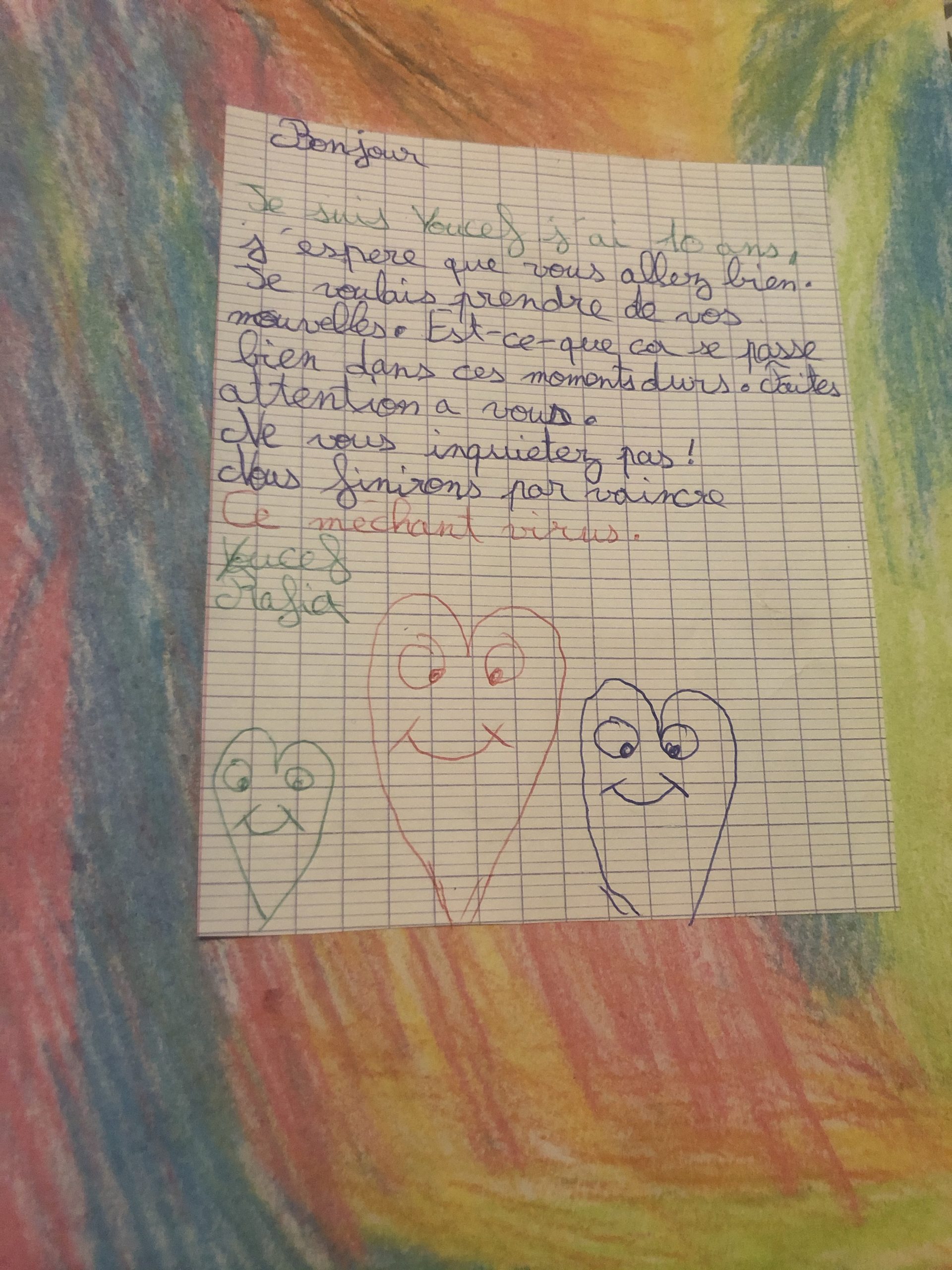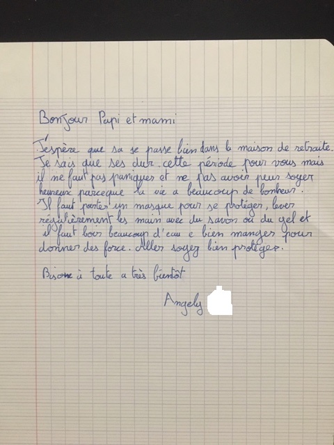 Bravo à eux pour cette belle solidarité et leur engagement, dès le plus jeune âge, pour nous aider à briser l’isolement. Un brin d’insouciance et un vent de bonne humeur planent désormais sur nos maisons, grâce à nos artistes en herbe !