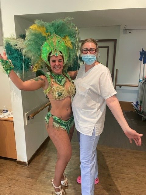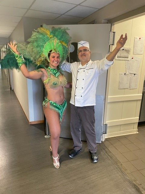 Le Brésil s’est avant tout une culture riche et variée, avec son célèbre carnaval, connu dans le monde entier, et c’est avec l’appui de l’équipe des aides-soignantes que les résidents des unités Hubiscus et Capucine ont fabriqué leurs propres masques de carnaval, un grand moment de création où chacun a laissé son imagination à la fête. Le Brésil c’est également l’hymne à la musique bien sûr la samba, la bossa nova…mais aussi la danse et pour cette occasion les résidents ont eu le plaisir d’accueillir une danseuse brésilienne en costume traditionnel de carnaval. Enfin, parler du Brésil c’est également évoquer son art culinaire churrasco, feijoada, caipirinha, guaraná… et pour cette journée le Chef et sa Brigade ont tout mis en œuvre pour assurer un repas à thème avec en dessert une belle salade de fruits aux couleurs brésiliennes concoctée par les résidents.